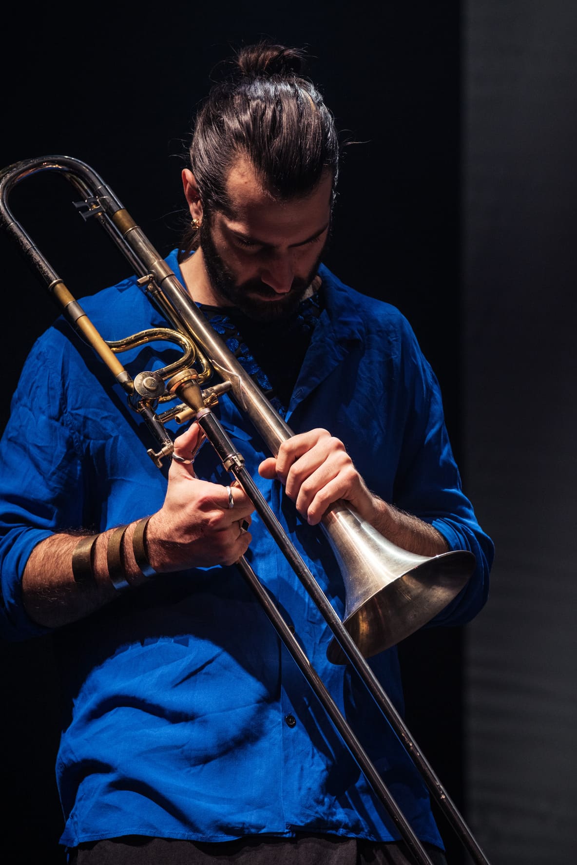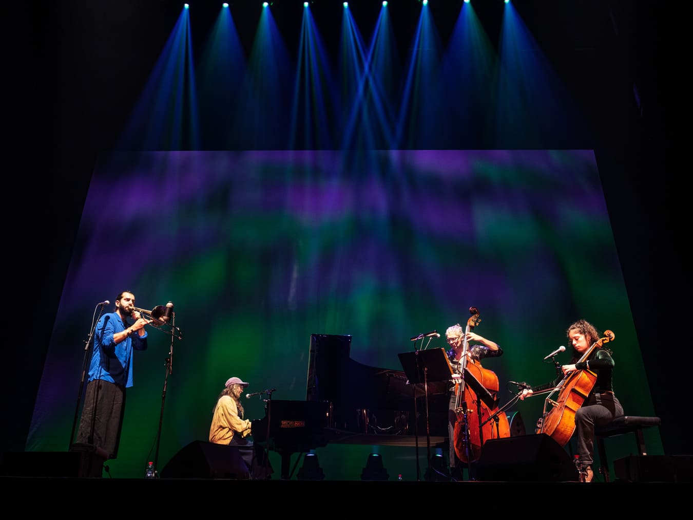 The festival opened with Robinson Khoury’s Quatuor Demi-Lune, a project marked by subtlety and depth. The French ensemble — trombone (Robinson himself), cello (Lina Belaïd), double bass (Simon Drappier) and piano (Eve Risser) — moves effortlessly between classical-inspired arrangements, Arab-French sonorities and refined extended techniques. Unisons, rubato passages, long pedals over Phrygianish modes, and a hypnotic, trance-like atmosphere permeate the music.