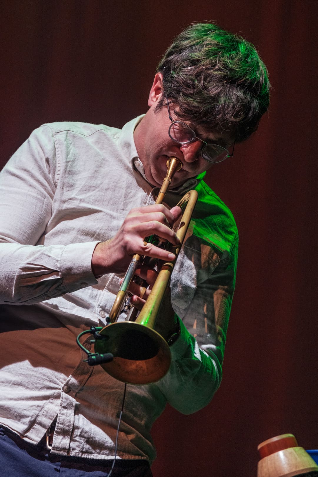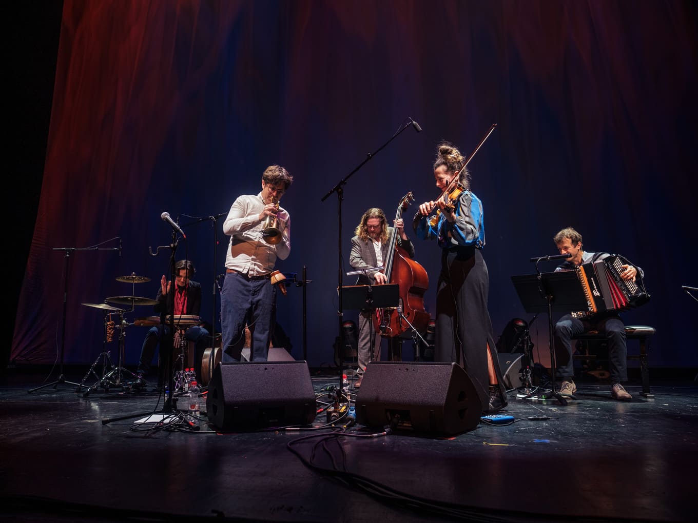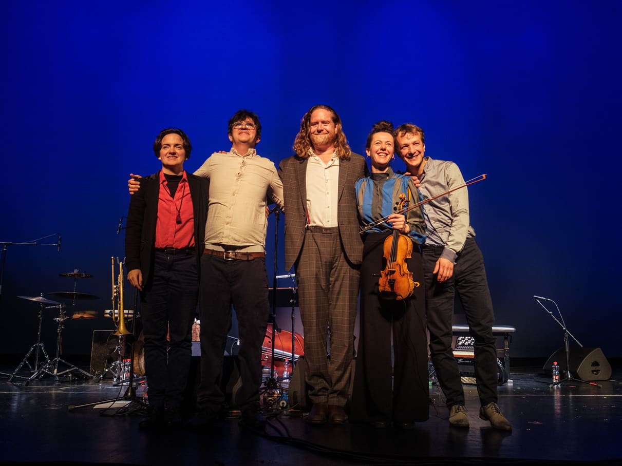 The evening at Theater Münster closed with the Richard Koch Quintet and their project Rays of Light. A young and daring formation: trumpet (Koch, leader and composer), violin (Fabiana Striffler), accordion (Valentin Butt), double bass (Andreas Lang) and percussion (Nora Thiele). From the opening piece — a flowing 3/4 with subtle rubato — the freshness of the group was evident.